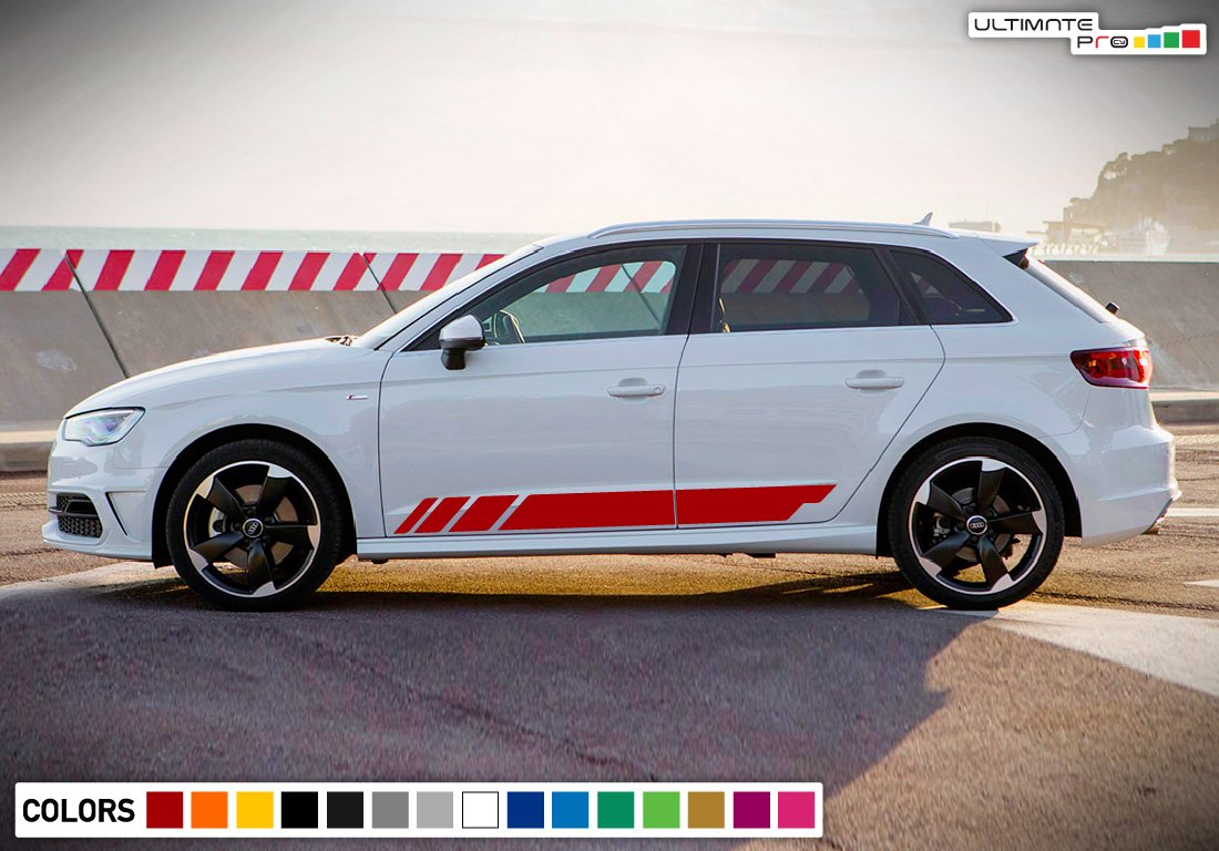 Decal Sticker Vinyl Side Sport Stripe Kit Compatible with Audi A3 2008-Present. Our decals vinyl is high quality polymeric and lasts 7 years outdoor. We can give the exterior of your car a unique look. You can choose from our wide selection of Graphics vinyl and decals. We manufacture stickers for American, Canadian and European car models as a coupe, saloon/sedan, SUV, pickup truck.